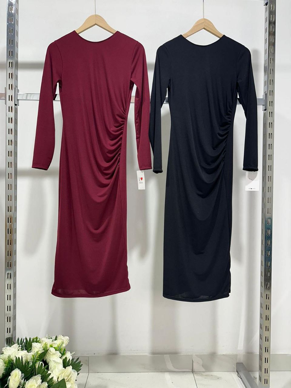 Questo abito lungo bordeaux, caratterizzato da maniche lunghe e arricciature frontali, offre una vestibilità elegante e femminile. Il taglio fasciante valorizza la silhouette, rendendolo ideale per occasioni raffinate in cui desideri distinguerti con sobrietà e stile.